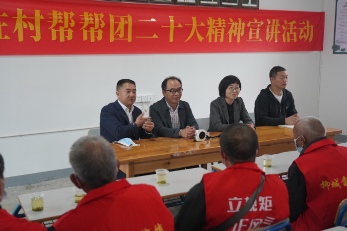 10月28日,金华职业技术学院党委委员、纪委书记徐领,党委委员、组织部部长、离退休工作处处长李文婷带领 “助村帮帮团”成员和部分退休教师,赴武义柳城畲族镇青坑村开展银领先锋助力共建共富暨二十大精神宣讲活动。