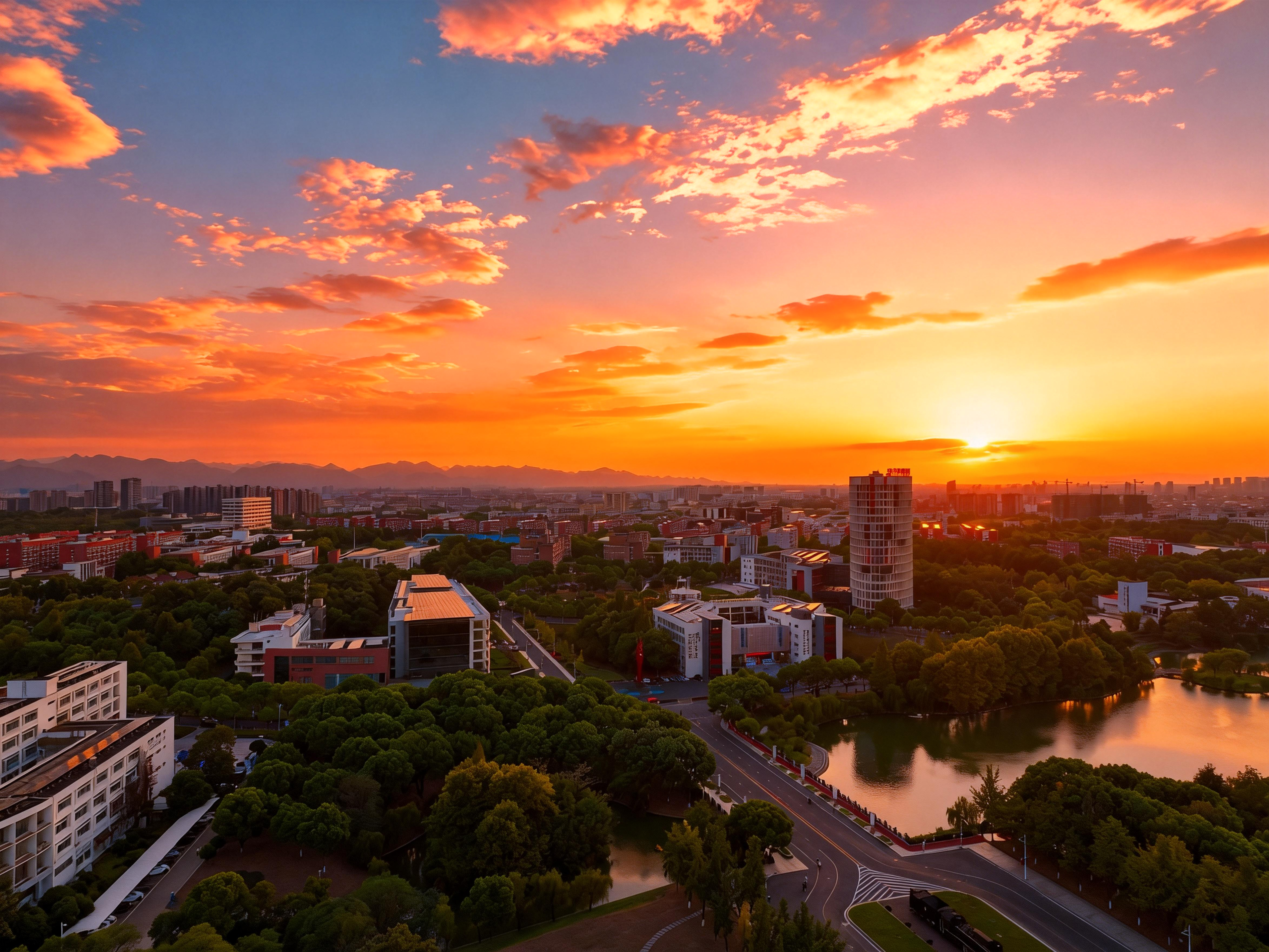 霞烧天际笼书苑 湖浸金晖树拥园