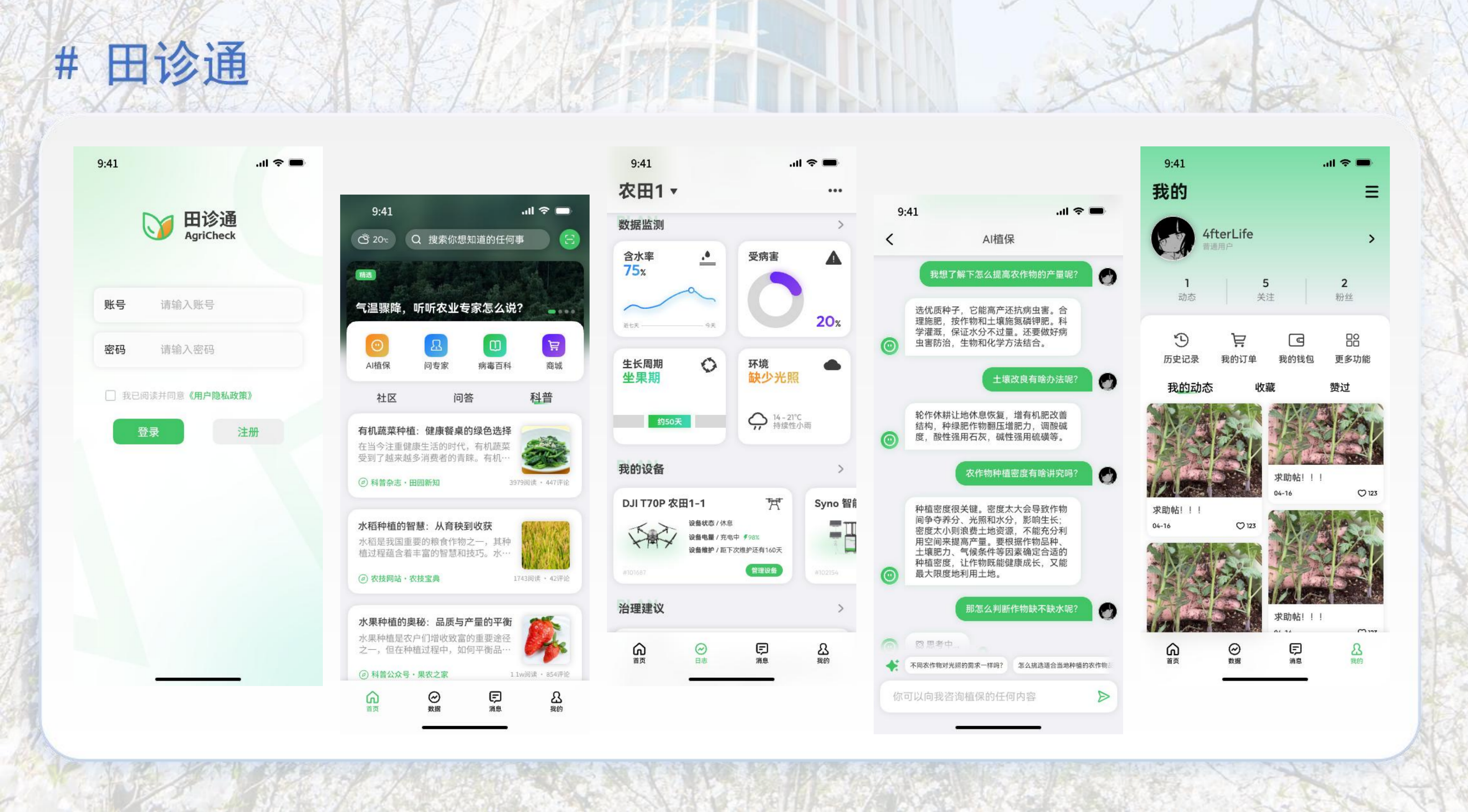 “让农户也能拥有专家级的病害诊断能力”——这是团队的初心。依托研究成果,软件开发工作室教师团队带领工作室学生开发了“田诊通”小程序—— 一款面向农户的智能植物病害识别工具。农户只需拍摄植物病害照片,通过小程序即可实现快速识别病害类型,查看病害详细信息和科学有效的防治措施建议;农户通过小程序查阅病害百科知识,浏览病害图文详情,提前预防病虫害;在线咨询人工专家或AI专家模块,为农户提供个性化指导;农户可通过参与社区问答、发布内容,与其他农户互动交流,分享种植经验。